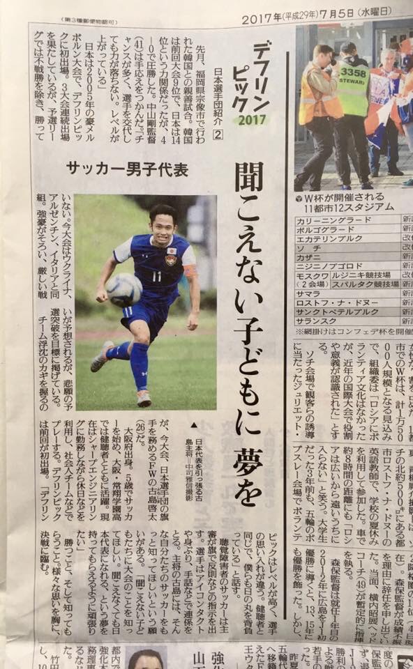 卒業生 古島先輩を応援しよう! by 常翔学園高校サッカー部 スタッフ on 2017年7月20日 with コメントはまだありません 昨日よりデフリンピックが開幕 日本代表vsウクライナが行われ、キャプテン古島啓太くんの直接FKで先制した日本代表は、2-1で初戦勝利を飾りました!引き続き応援よろしくお願いします。 ◇デフリンピック情報◇ 第23回夏季デフリンピック in トルコ(サムスン) 情報 予選リーグ日程(日本時間) *時間、場所は変更される場合がございます。 7月21日(金)vs アルゼンチン 22:00 KO(現地時間16:00 KO) Canik 19 Mayis Stadium 7月24日(月)vs イタリア 0:00 KO(現地時間23日18:00 KO 共有:シェアTwitterFacebook 関連